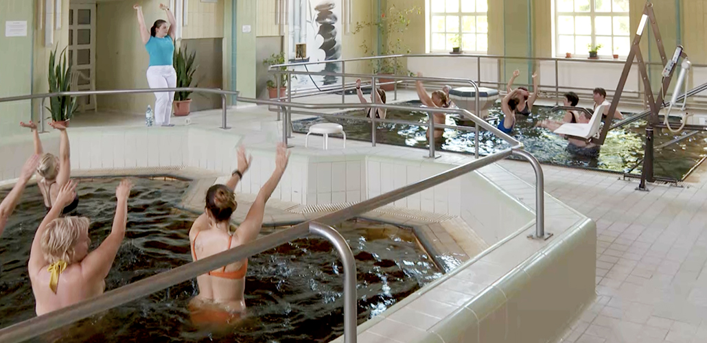 A vízben a betegek olyan mozgásokat végezhetnek, amelyek a szárazföldön gyakran nem lennének lehetségesek – például járás, futás vagy ugrálás. Gyopáros gyógyfürdőben a csoportos fizikoterápia egy speciális terápiás medencében zajlik, amely két egymás mellett elhelyezkedő medencéből áll. A víz hőmérséklete kellemes 34–35 °C. A gyakorlatokhoz különböző segédeszközök állnak rendelkezésre, például vízi úszógumik, vízi súlyzók és súlyzó rudak. A gyakorlatok időtartama: 25 perc.